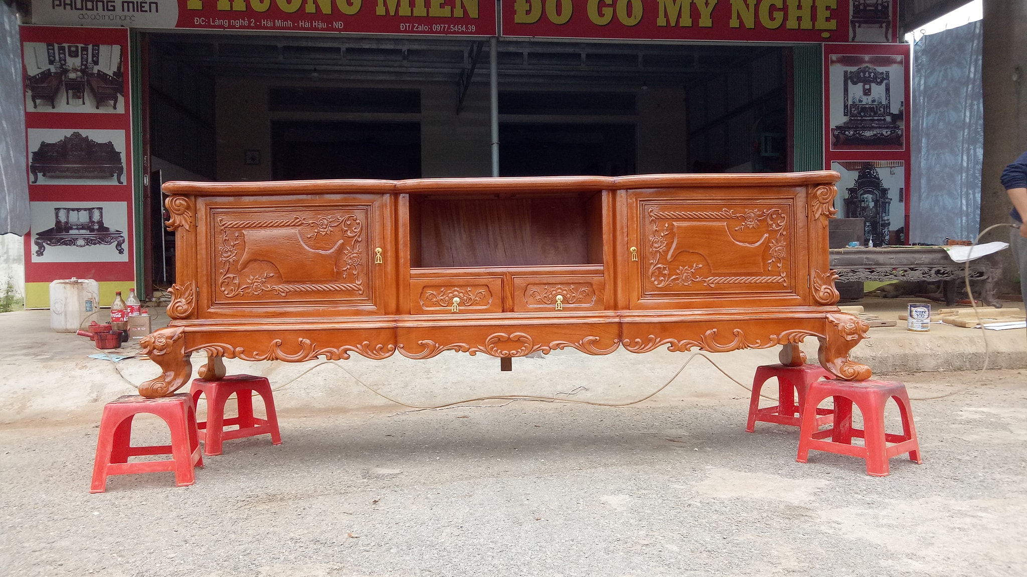 Cơ sở sản xuất và trang trí nội thất đồ gỗ Phương Miên xin được chân thành cảm ơn anh Hưng tại địa chỉ : 6/5 Phan Thúc Duyệt phường 4 quận Tân Bình- tp. Hồ Chí Minh. Anh đã tin tưởng đặt hàng tại cơ sở của chúng tôi. Sản phẩm gồm 1 bộ bàn trang điểm hoa hồng gỗ gõ đỏ và một kệ tivi mẫu lu-y gỗ gõ đỏ.