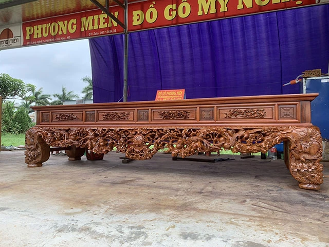 Vì là bàn thờ được đặt tại một ngôi chùa lớn có tuổi đời đã mấy trăm năm. Đây là bàn thờ được đăt bên trong dùng để các tăng ni phật tử đặt đồ hoa lễ trên đó. Vậy nên nó có một kích thước vô cùng lớn. Theo trao đổi với người đại diện ở chùa là chú Nguyễn Đĩnh là thống nhất làm hai bộ có kích thước khác nhau: