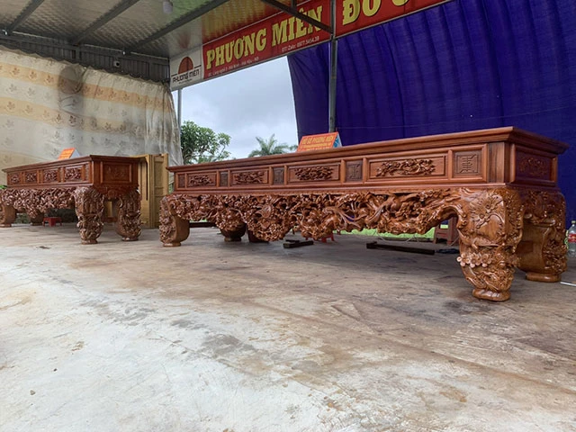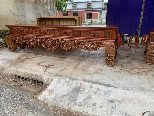 Một bộ có kích thước: chiều ngang 4m x cao 90cm x cao 85cm. Vai tiền làm dày liền khối 12cm, vai ngang dày 10cm và chân làm vuông 26cm. Và một bộ có kích thước: Chiều ngang 3m6 x cao 1m x sâu 60cm. Vai tiền làm dày 12cm, vai ngang dày 10cm và chân làm vuông 26cm.