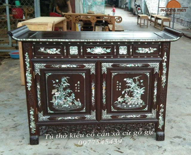 Tủ thờ là danh từ riêng được dùng để bầy trí đồ thờ, đồ lễ được đặt trên bề mặt để tưởng nhớ, thờ cúng tổ tiên. Ở kiểu mẫu này đó là sự kết hợp những đường chạm trổ và những đường nét cẩn sà cừ. Điển tích chính vẫn là những đường nét chạm trổ. Những đường nét cẩn sà cừ làm nổi bật lên giá trị của những kiểu mẫu đó.