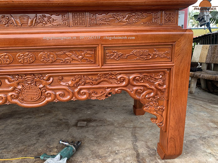 Bàn thờ gỗ hương đá chạm như ý nền đẹp. Rộng 1m97 x cao 1m27 x sâu 97. Miễn phí vận chuyển và lắp ráp tận nơi trên mọi miền tổ quốc.