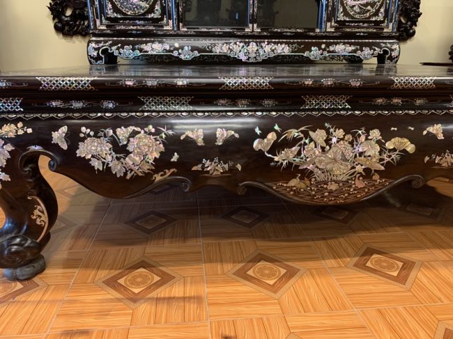 Vách tiền của bộ sập gụ khảm liên chi đẹp.