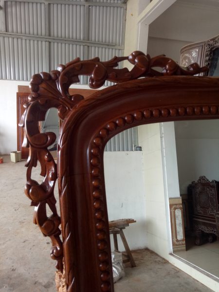 Khung gương được làm từ chất liệu gỗ gụ Gia Lai ( gỗ gụ mật ) . Là loại gỗ Thuộc nhóm gỗ quý của Việt Nam chúng ta. Đặc điểm là loại gỗ này ít cong vênh phù hợp với làm khung tranh cho những tác phẩm trang trí nội thất. Những họa tiết hoa lá tây quen thuộc trong trang trí nội thất. Tác phẩm thể hiện được những nét độc đáo, tinh sảo trên từng đường nét. Bên trong là phần gương nhập khẩu từ BỈ ( gương tráng bạc).