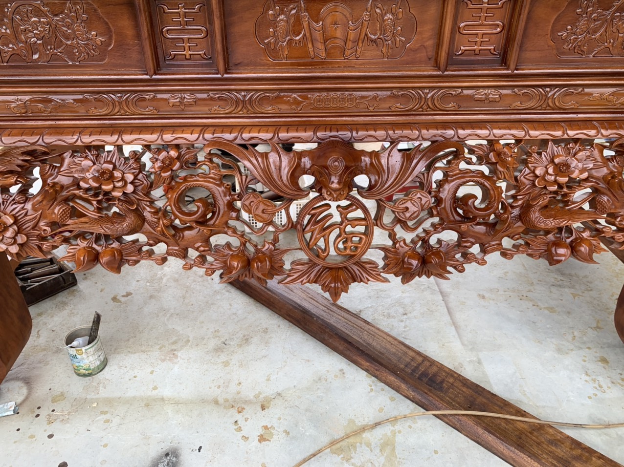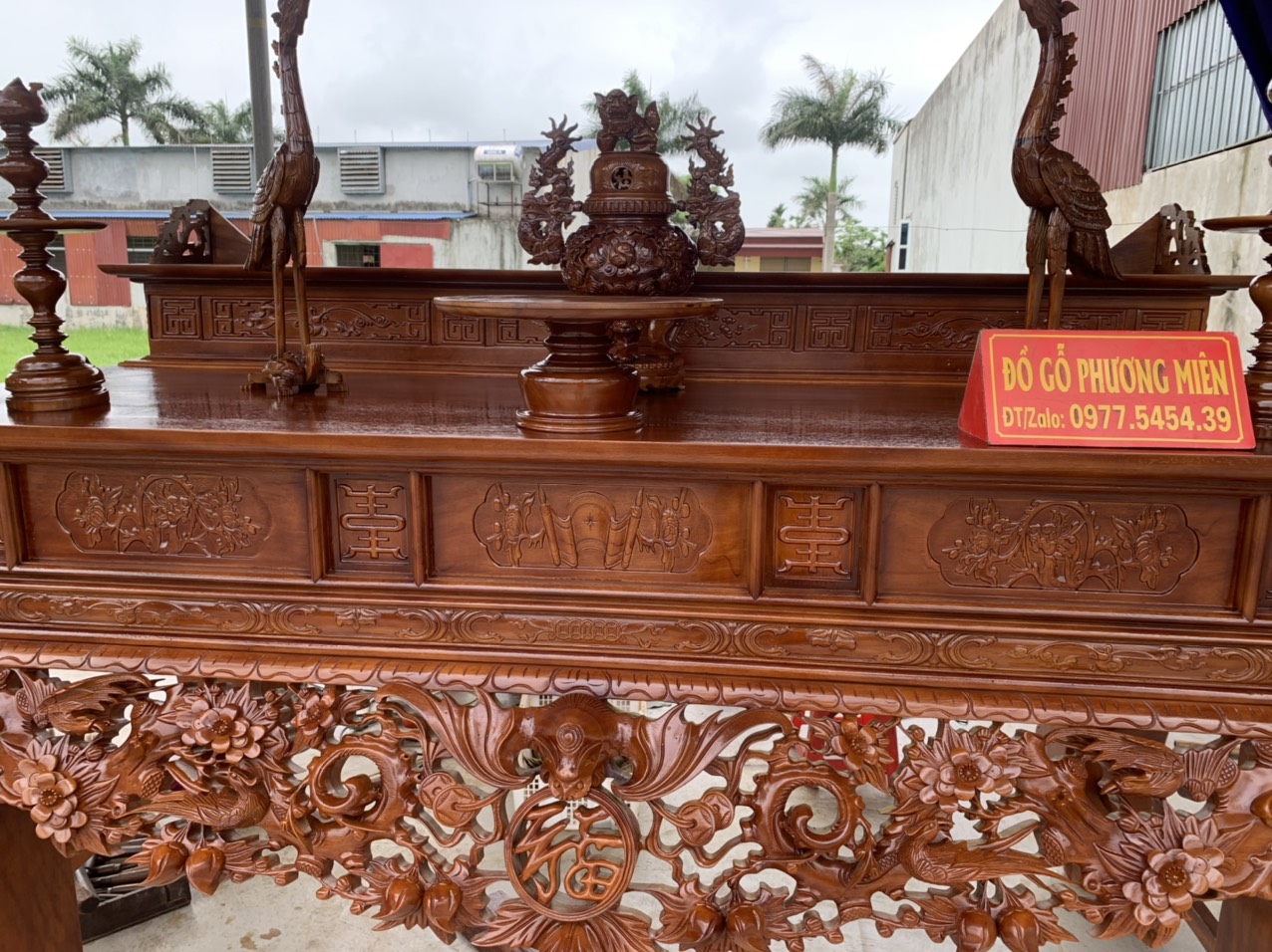 Sập thờ mai điểu nhị cấp gỗ mít. Bàn thờ hoa mai dài 2m17.