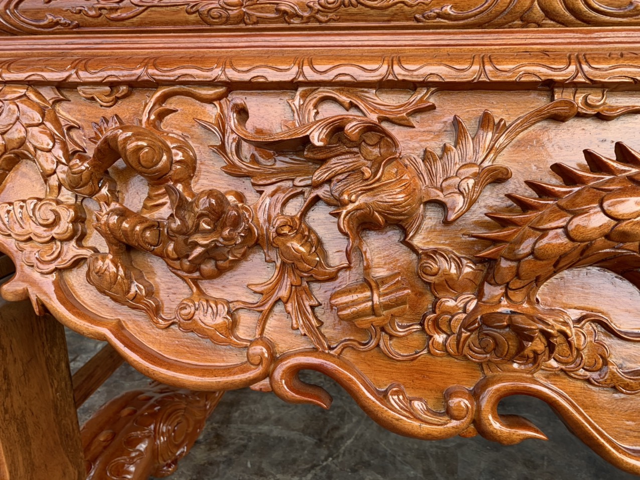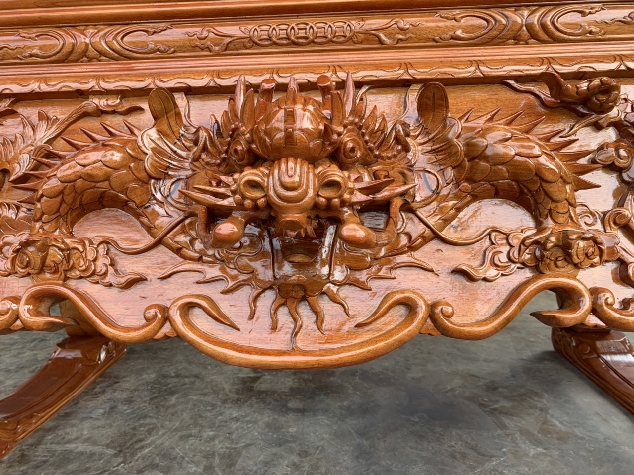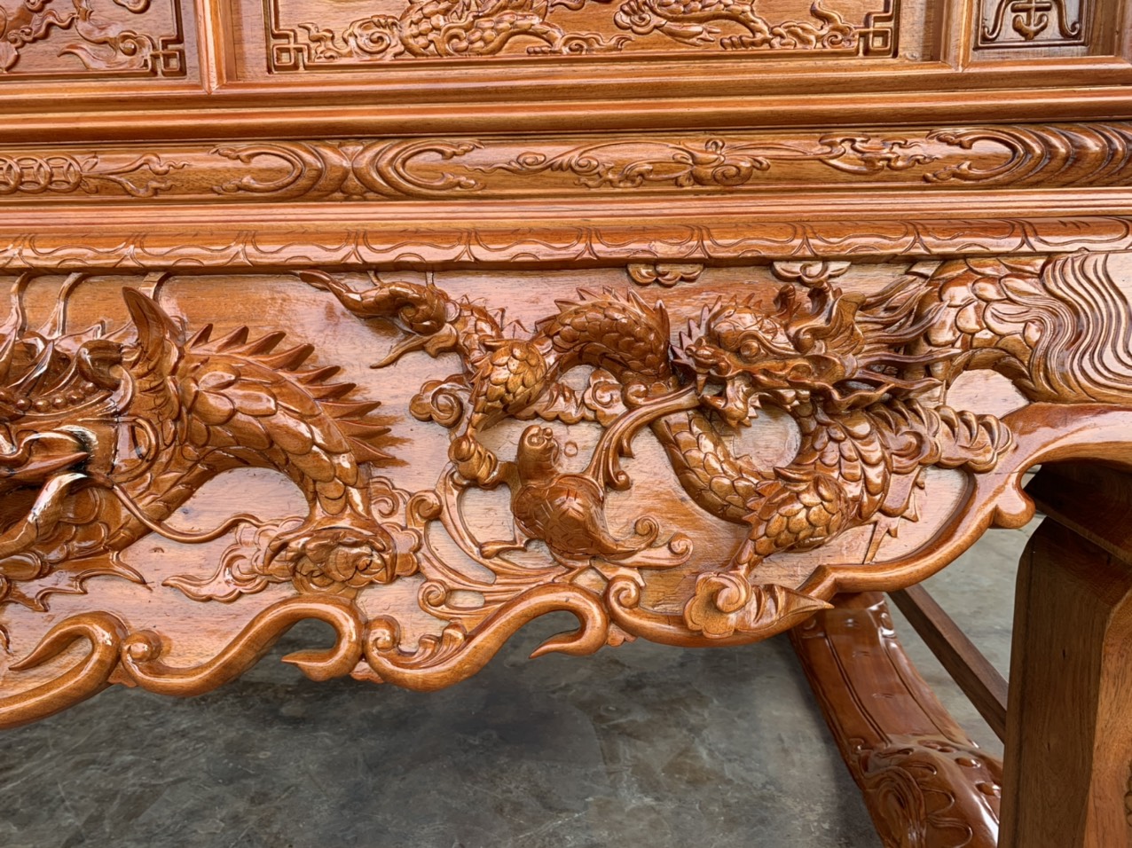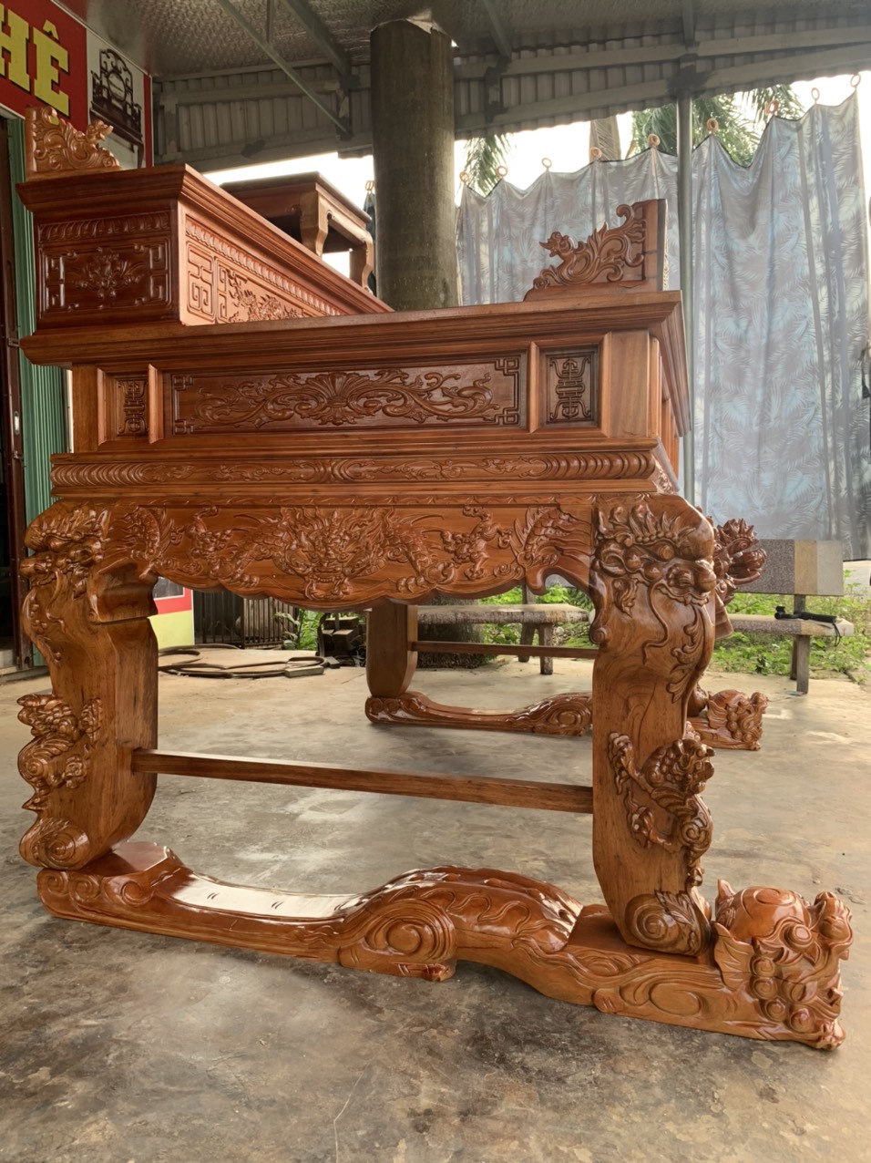 Sập thờ nhị cấp chạm tứ linh gỗ gụ.