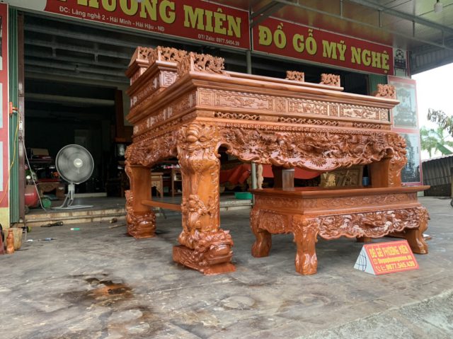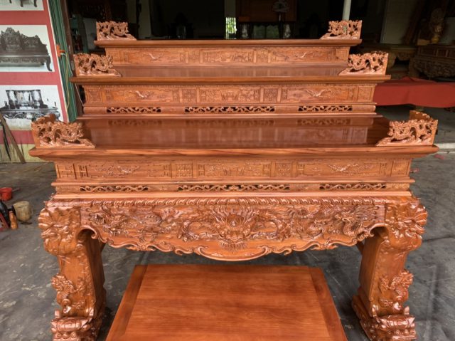 Sập thờ tứ linh tam cấp gỗ đỏ to rộng lớn.