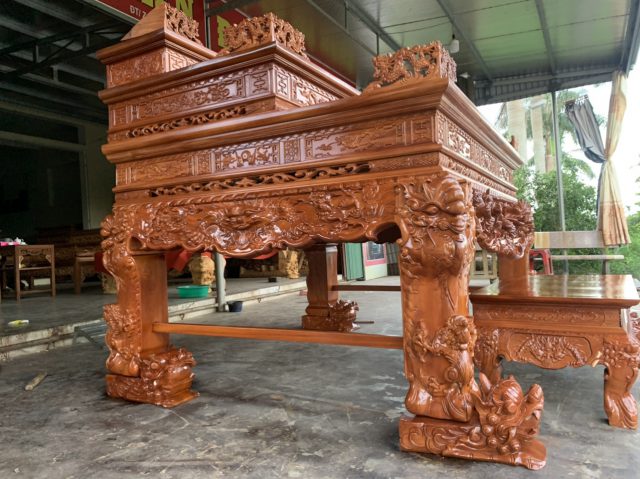 - Thi công phần mộc: Đây đều là những sản phẩm kênh bong dày dặn nên chính vì thế tất cả phải được đục bằng tay. Như thế thì mới thể hiện hết được những đường nét tinh sảo. Đặc biệt là những cái hồn được thể hiện trên những vách tiền và chân bộ sập thờ tứ linh này. Dù cho ngày nay được hỗ trợ của công nghệ máy CNC. Tuy nhiên nó chỉ là sự cộng hòa để cái tiến nhanh hơn thôi. Chứ không thể là hoàn toàn 100% như những sản phẩm rẻ tiền. Đây cũng là khâu mất nhiều thời gian nhất. Để hoàn thành được nó thì cũng phải mất 15 ngày.