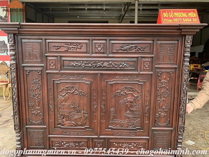 Tủ thờ Huế chạm cảnh sơn thuỷ đẹp.