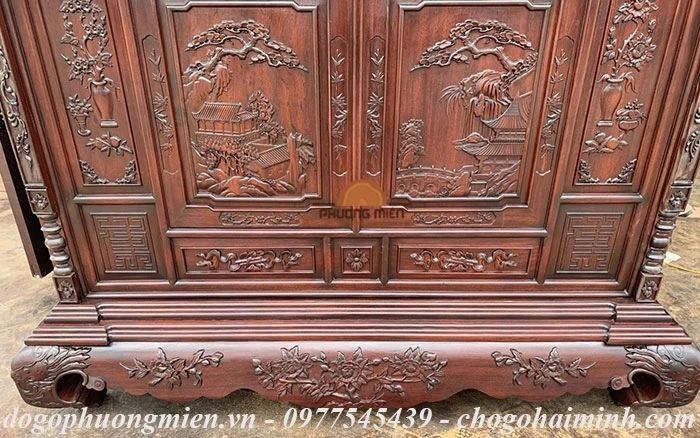 Những phần lô đục và chạm khắc hoa văn không hề giống nhau, kể cả phần hông tủ hay bệ tủ. Tất cả đều được chạm khắc bằng tay 100%, được thể hiện rất sắc sảo và tinh tế. Vậy nên, để cho ra một sản phẩm đẹp chất lượng như thế này? Đòi hỏi người thiết kế mẫu phải chuẩn từ kích thước cho đến chi tiết các hoa văn.